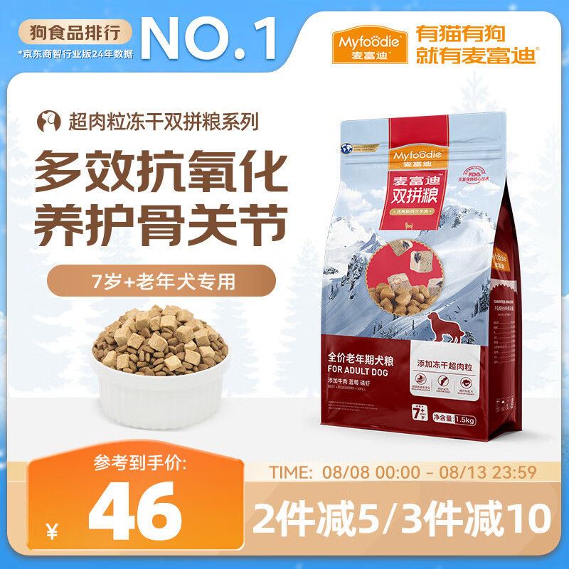 麦富迪狗粮 超肉粒冻干老年犬粮7岁+抗初老(牛肉蓝莓磷虾)1.5kg