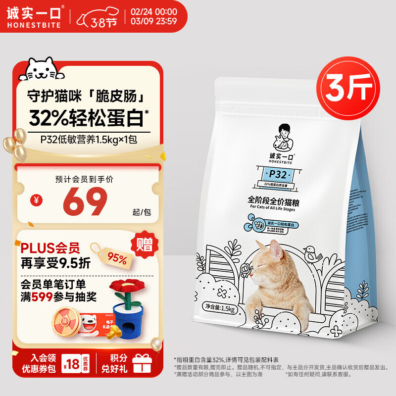 诚实一口P32全价猫粮成猫幼猫低敏轻松蛋白守护肠胃营养1.5kg