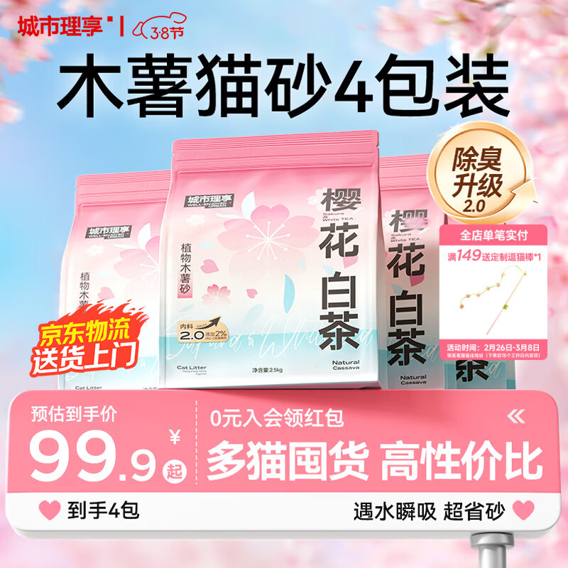 城市理享樱花白茶除臭颗粒瞬吸结团食用级木薯猫砂2.5kg*4不粘底不散团