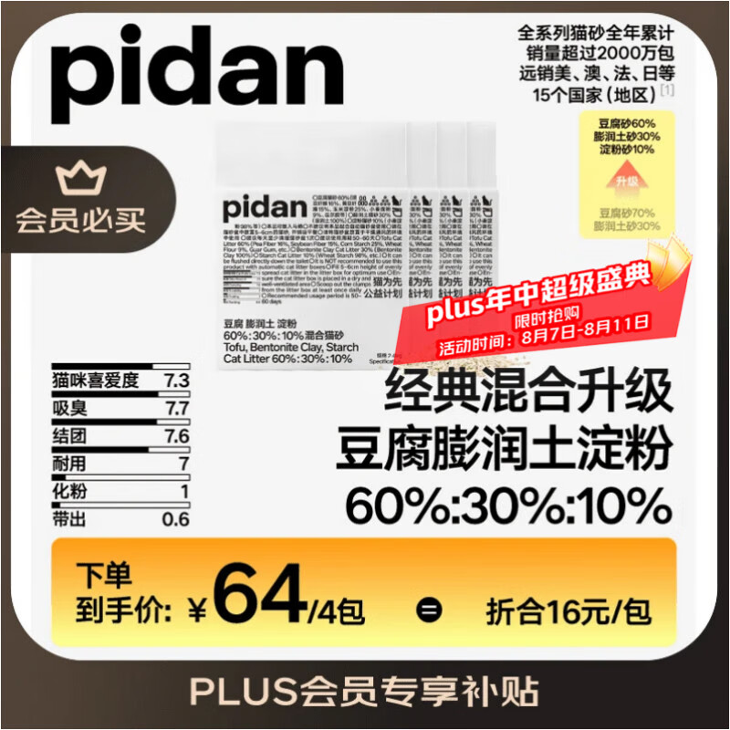 pidan混合猫砂 豆腐膨润土淀粉60%:30%:10%混合2.4kg*4包自营猫砂